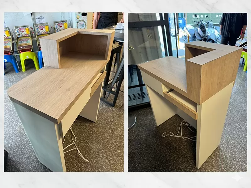 為客戶客製化木作櫃台,內部配置依客戶需求配置一個封閉抽屜及開放式抽屜,櫃檯前方安裝壓克力LOGO燈箱接線光源配置,尺寸造型提供客製化服務,櫃台需求歡迎聯繫討論。